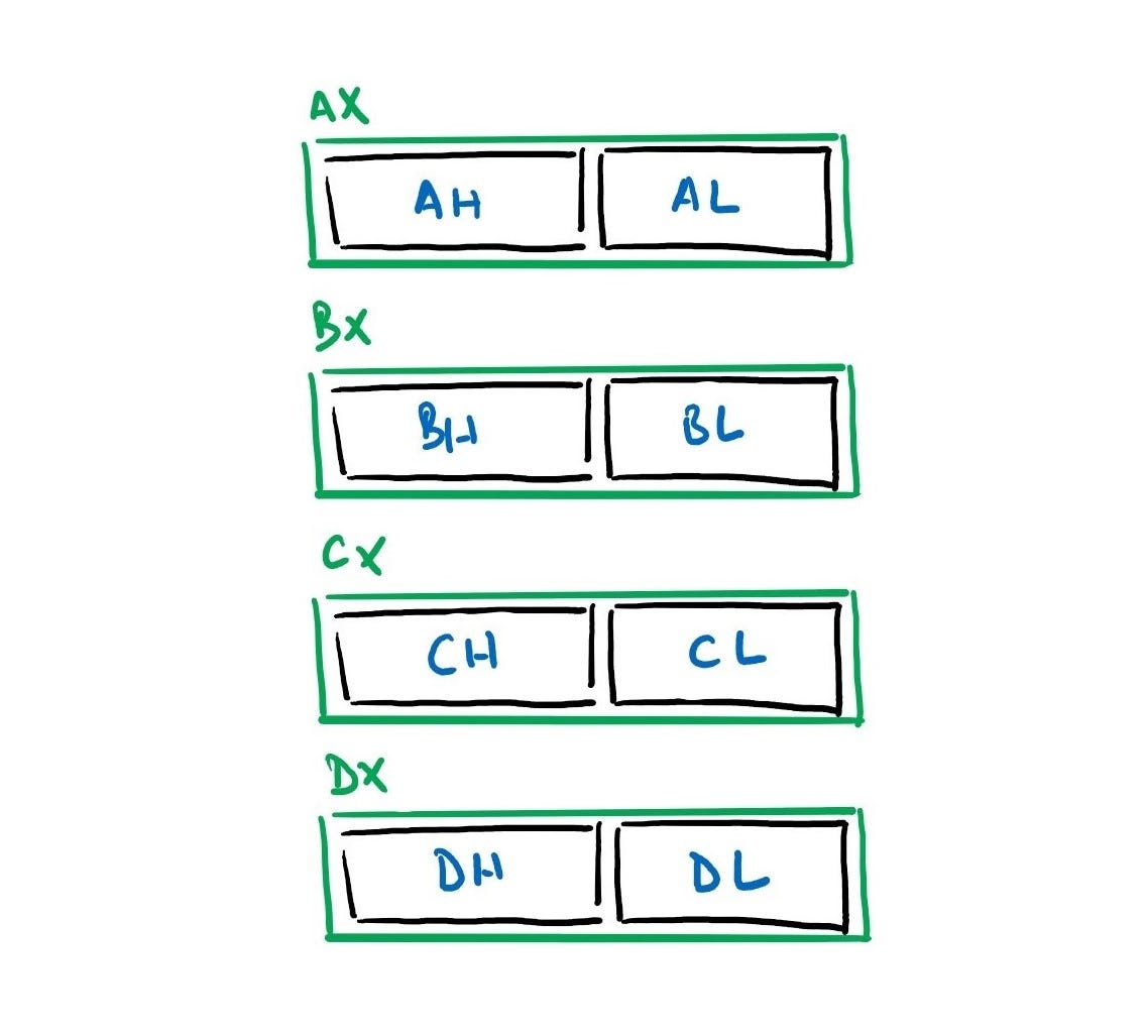 Fast forward a few years later, the Intel 8086 came out. The architects of the 8086 added a slew of other registers, and made them 16-bit in size. Among all the changes, the original A, B, C, and D registers had a slight modification to their names. Since the registers are 16 bits now, we can divide the original registers up into two 8-bit registers like these: