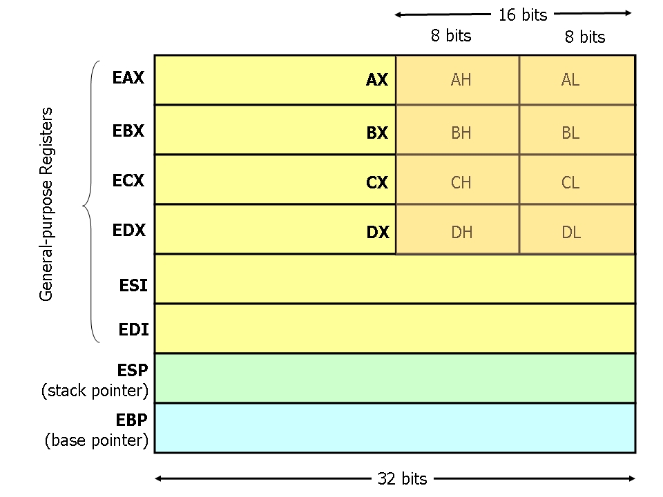 EAX is the accumulator register.EDX is the data register.EBX is the base register.ESP is the extended stack pointer.EBP is the extended base pointer.EIP is the extended instruction pointer.